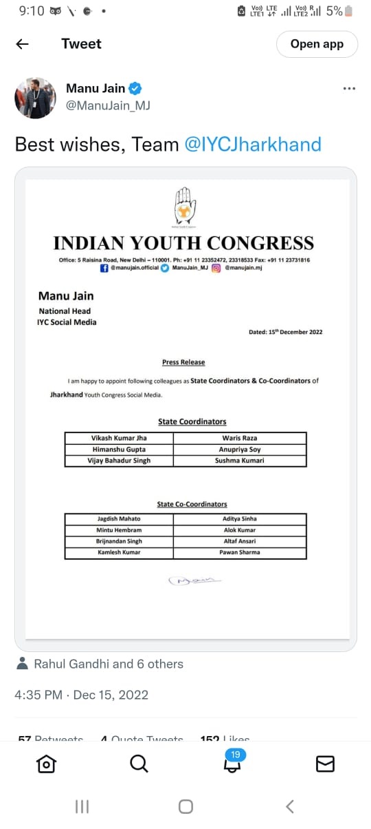 युवा कांग्रेस के सोशल मीडिया विभाग के नेशनल हेड श्री मनु जैन इस पुनर्गठन की कार्यवाही पर अपनी नजर बनाए रखा और एक युवा और कर्मठ सोशल मीडिया टीम बनाई झारखंड में ऐसा प्रतीत होता है .